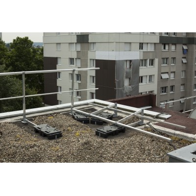 SAFEall GUARD FOLDABLE je bezpečnostní zábradlí s kloubem a možností složení, které je vhodné pro použití, zejména na plochých střechách