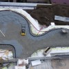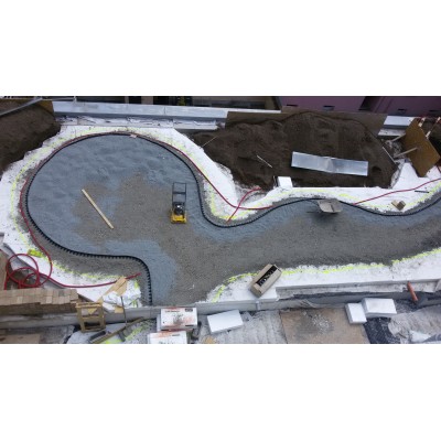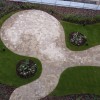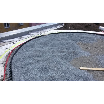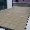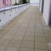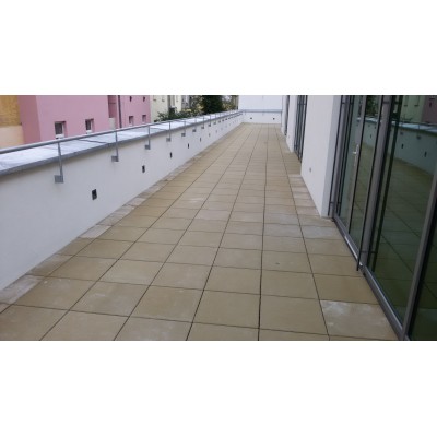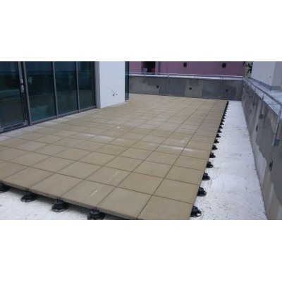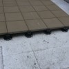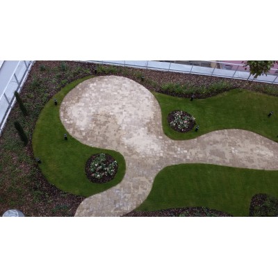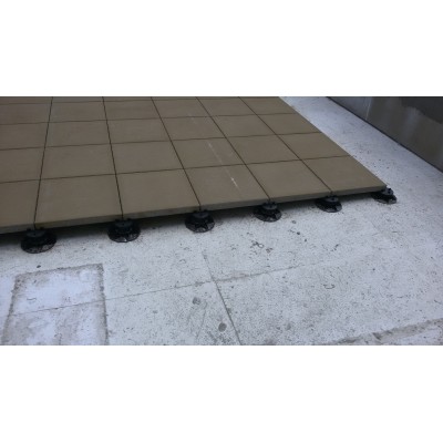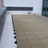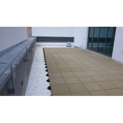 Betonová dlažba na teleskopických terčích a zelená střecha v kontaktu s plochou zámkové dlažby.